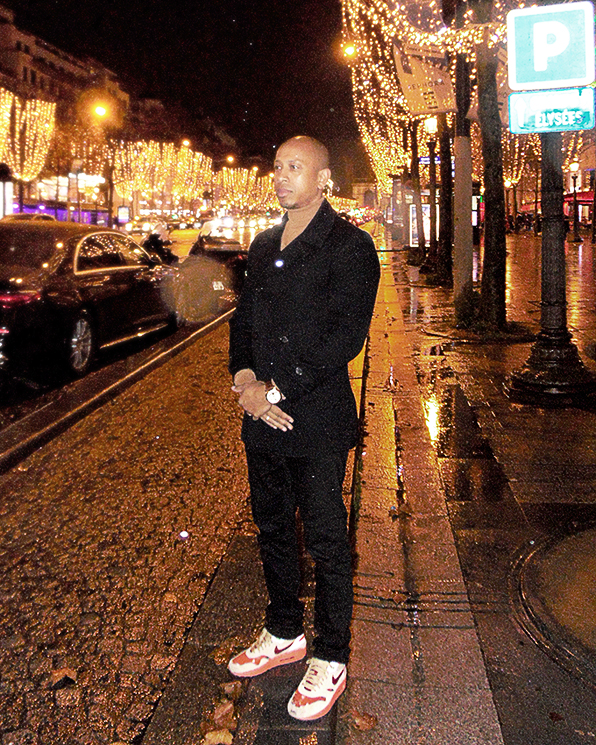 Il a été précédé sur place de son double Kanta, à la carrure patibulaire et l’air observateur. C’est en trio que va se dérouler la rencontre. Des hommes de l’ombre au partenariat solide, forgé depuis leur jeunesse. Deux esthètes qui prennent leurs distances avec une certaine idée de la célébrité. Un statut non-applicable à leurs yeux, car ils préfèrent naviguer lorsque les lumières sont éteintes. Malgré tout, ce seront celles de la plus belle avenue du monde qui éclaireront le décor de notre shooting photo sous la rosée. Nous effectuons cet exercice quelques semaines plus tard, en toute improvisation. EKF a été saisi lors d’un nouveau passage dans la capitale française, à quelques jours du réveillon de Noël.