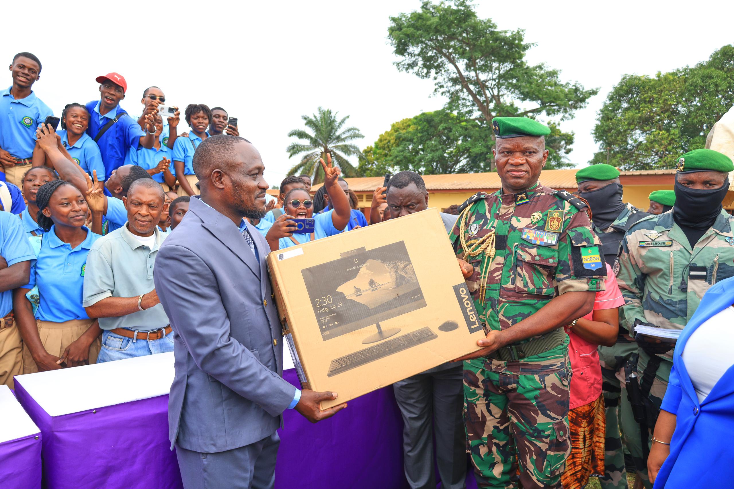 Moanda, le 9 février 2024 Au deuxième jour de sa visite à Moanda dans la province du Haut Ogooué, le Président de la Transition, Président de la République, Chef de l’État, le Général Brice Clotaire Oligui s’est rendu au lycée technique Fulbert Bongotha de Moanda afin d’offrir du matériel pédagogique à la communauté éducative des villes de Moanda, Mounana et Bakoumba.