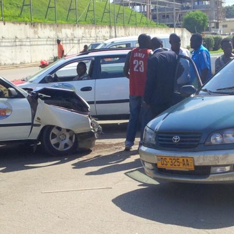 L’accroc s’est déroulé aux environs de 15 heures, quand un véhicule de couleur de vert revenant des Affaires Etrangères a souhaité traverser la voie qui fait le sens opposé pour se rendre au super marché Mbolo. Au même moment un autre véhicule à usage de taxi venait à vive allure, n’ayant pas ralenti à l’approche de l’intersection, ce dernier a percuté l’arrière de la voiture verte qui avait presque réussi à traverser la voie.