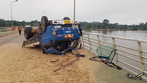 On ne cessera jamais de crier "prudence sur la route". Les accidents de la route deviennent tellement récurrents de nos jours. Sur le pont d’Adouma de la commune de Lambaréné, dans le premier arrondissement, un fuso canter, communément appelé TM a failli terminer son trajet au fond du fleuve Ogooué. N’eût été la vigilance du chauffeur qui a périlleusement manœuvré son véhicule pour éviter le taxi et le ravin, geste qui a failli lui coûter la vie.