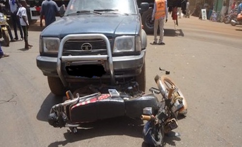 Le conducteur à moto, un jeune étudiant de l’Institut Supérieur de Technologie (IST) rentrait des cours. Engagé sur la voie, il a remarqué le véhicule (pick-up) revenant du carrefour SNI s’engager pour prendre la direction du quartier razel. Ce dernier ne respectant pas la priorité et n’entendant pas les klaxons du motard prioritaire sur la voie, est allé violemment percuté l’étudiant. Les riverains qui ont assisté à la scène ont accouru pour s’enquérir de la situation du motard qui, s’en tire avec des blessures superficielles. Toutefois, il lui a été recommandé de se faire examiner pour écarter tout danger.