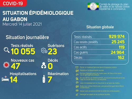 Nous avons enregistré 47 nouveaux cas positifs sur 10 055 tests réalisés, soit un taux de positivité de 0.5%, 14 personnes hospitalisées dont 07 en réanimation pour détresse respiratoire, 23 nouvelles guérisons et 00 nouveau décès.