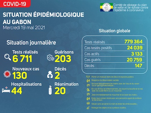 Nous avons enregistré 130 nouveaux cas positifs sur 6 711 tests réalisés, soit un taux de positivité de 1.9%, 44 personnes hospitalisées dont 20 en réanimation pour détresse respiratoire, 203 nouvelles guérisons et 02 nouveaux décès à Libreville.