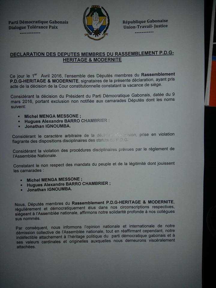 Ce jour le 1er Avril 2016, l’ensemble des Députés membres du Rassemblement PDG-ERITAGE & MODERNITE, signataires de la présente déclaration, ayant pris acte de la décision de la Cour Constitutionnelle constatant la vacance de siège.