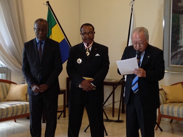 Dans son allocution, Masaaki Sato a retracé le parcours d’un diplomate et haut fonctionnaire aguerri, dont les hautes responsabilités n’ont pas effrayées. Successivement Directeur adjoint chargé des institutions financières au Ministère gabonais de l’économie, Conseiller représentant du Gabon et membre du Conseil d’administration du FMI, il a aussi été Coordinateur et Conseiller technique à la Banque mondiale. « M. l’Ambassadeur, je vous adresse toutes mes félicitations les plus chaleureuses pour vos actions florissantes, et vous rend hommage pour les efforts acharnés accomplis durant ces dernières années », a déclaré le représentant japonais.