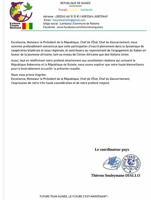 Dans ce contexte de haute portée institutionnelle, Emmanuel Obakamba Ombana, Coordonnateur général du Forum National des Organisations de Jeunesse du Gabon, a été officiellement convié à prendre part à cet événement par Monsieur Thierno Souleymane Diallo, Coordinateur pays de Future Team Guinée-Conakry, organisation de référence engagée aux côtés des autorités guinéennes dans l’accompagnement des politiques publiques en faveur de la jeunesse et du développement national.