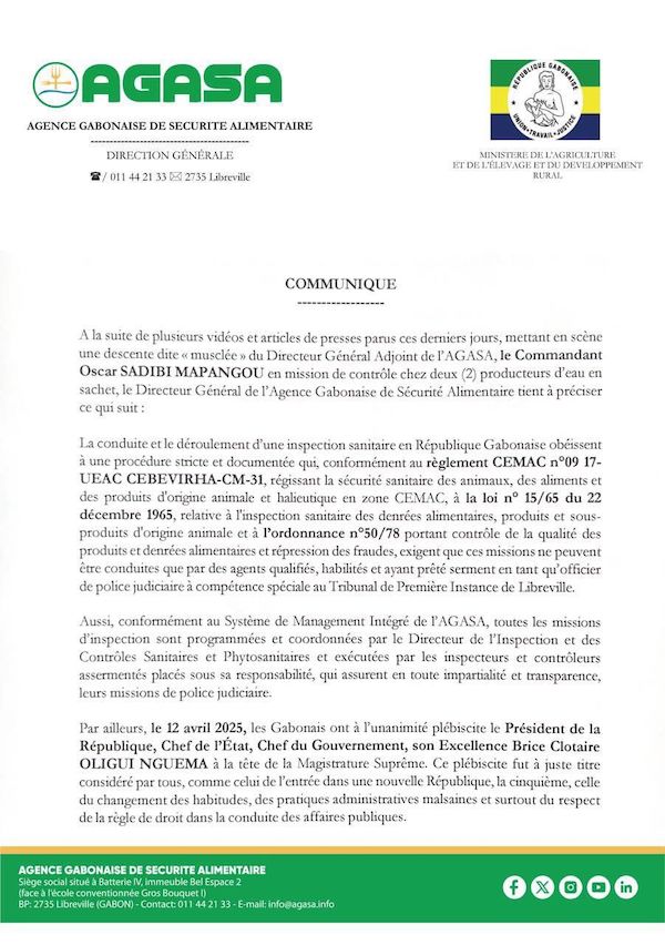 Jean Delors Biyoghe Bi Ntougou, Directeur Général de l’agence gabonaise de sécurité alimentaire (Agasa), dans un communiqué paru ce mardi 27 mai 2025, désavoue son adjoint, le commandant Oscar Sadibi Mapangou. Des raisons évoquées, "inspections cavalières". Le patron de l’Agasa veut mettre fin à ces pratiques.