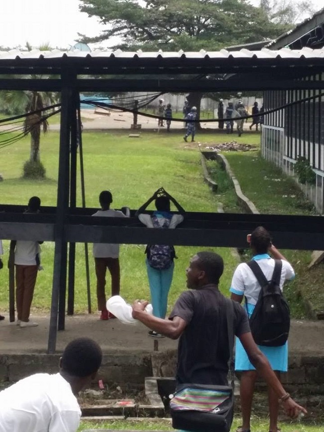 C’est lundi ! Les policiers errent les lieux. Les élèves, comme à leur habitude, regagnent leurs salles de classe respectives. Les premiers cours de la journée sont dispensés. Il sonne 9H15, la récréation, quelques élèves tentent d’aller rencontrer les membres de l’administration. Surpris, les élèves constatent de plus en plus la présence des hommes en treillis au sein de l’établissement. La tension commence à monter entre les deux parties. Intimidation, gaz lacrymogènes, violences physiques sont entre autres moyens employés par les forces de l’ordre.