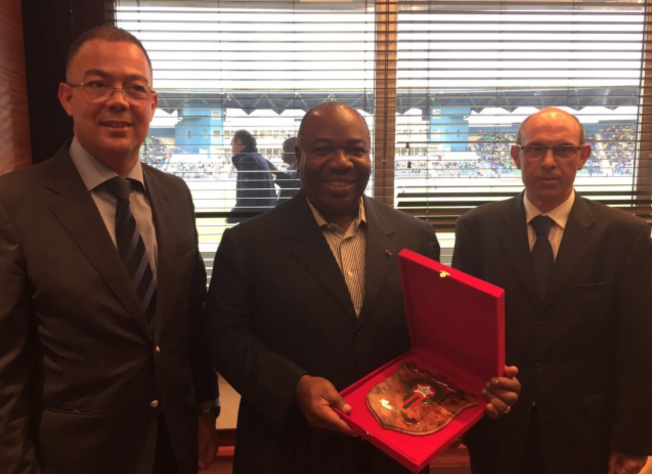 Le Chef de l’Etat avec (à sa gauche) l’ambassadeur du Royaume du Maroc au Gabon, M. Ali Bojji, et (à sa droite) le président de la Fédération royale marocaine de football, M. Faouzi Lakjaa.