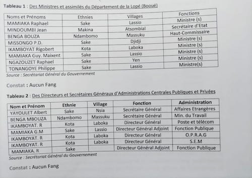 « Depuis le départ des colons du Gabon, certaines ethnies à l’image des saké, Kota, Ndambomo, se sont appropriées Booué comme un terrain avec titre foncier », fulmine un notable Fang de la localité. Dans les faits, les fonctions nominatives telles que, Membre du Gouvernement, Secrétaires Généraux des ministères, Conseillers de Chef de l’État, Directeurs Généraux des entités étatiques, para étatiques et privées, ainsi que des fonctions électives comme celles des Députés Titulaires, Sénateurs Titulaires et Présidents du Conseil Départemental ont toujours été trustées par les communautés citées plus haut. Tout se passe comme si la communauté Fang de Booué devait s’astreindre à jouer les seconds rôles dans l’échiquier politique local.