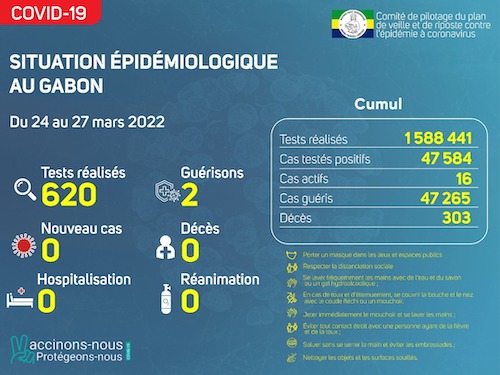 Nous avons enregistré 00 nouveau cas positif sur 620 tests réalisés, soit un taux de positivité de 0.00%, 00 personne hospitalisée dont 00 en réanimation, 02 nouvelles guérisons et 00 nouveau décès.