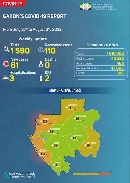 – Woleu Ntem : 03 nouveaux cas positifs sur 06 prélèvements, dont 02 à Bitam et 01 à Oyem, soit un total de 508 cas confirmés.