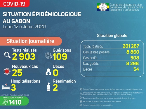 Estuaire : 25 nouveaux cas positifs sur 2 903 prélèvements à Libreville, soit un total de 6 280 cas confirmés.Concernant la prise en charge : -3 personnes hospitalisées ; -2 patients en réanimation ;-109 guérisons soit un total de 8 298 personnes guéries ;- 0 décès.