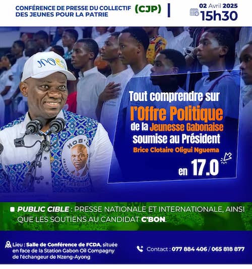 Alors que le Gabon s’apprête à entrer dans une phase décisive avec l’élection présidentielle du 12 avril 2025, la jeunesse gabonaise refuse de rester en marge de cet enjeu majeur. Représentant plus de 60 % de la population, elle se positionne comme un acteur central du développement national. C’est dans cette dynamique que les membres du Collectif des Jeunes pour la Patrie (CJP) ont organisé une conférence de presse le mercredi 2 avril 2025 au siège de la FCDA, afin de présenter à la population, aux jeunes et à la communauté internationale, une Offre Politique Spéciale soumise au Président de la Transition, Brice Clotaire Oligui Nguema, pour les sept prochaines années.