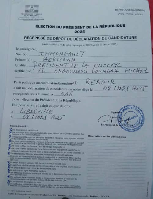 La Commission Nationale d’Organisation et de Coordination des Élections et du Référendum (CNOCER) a rejeté la candidature de Michel Ongoundou Loundah. Une décision qui suscite la controverse, d’autant plus que c’est son propre parti, la Réappropriation du Gabon, de son Indépendance, pour sa Reconstruction (Réagir), qui a contesté son dossier, invoquant l’article 87 du Code électoral. Ce dernier dénonce une manœuvre politique.